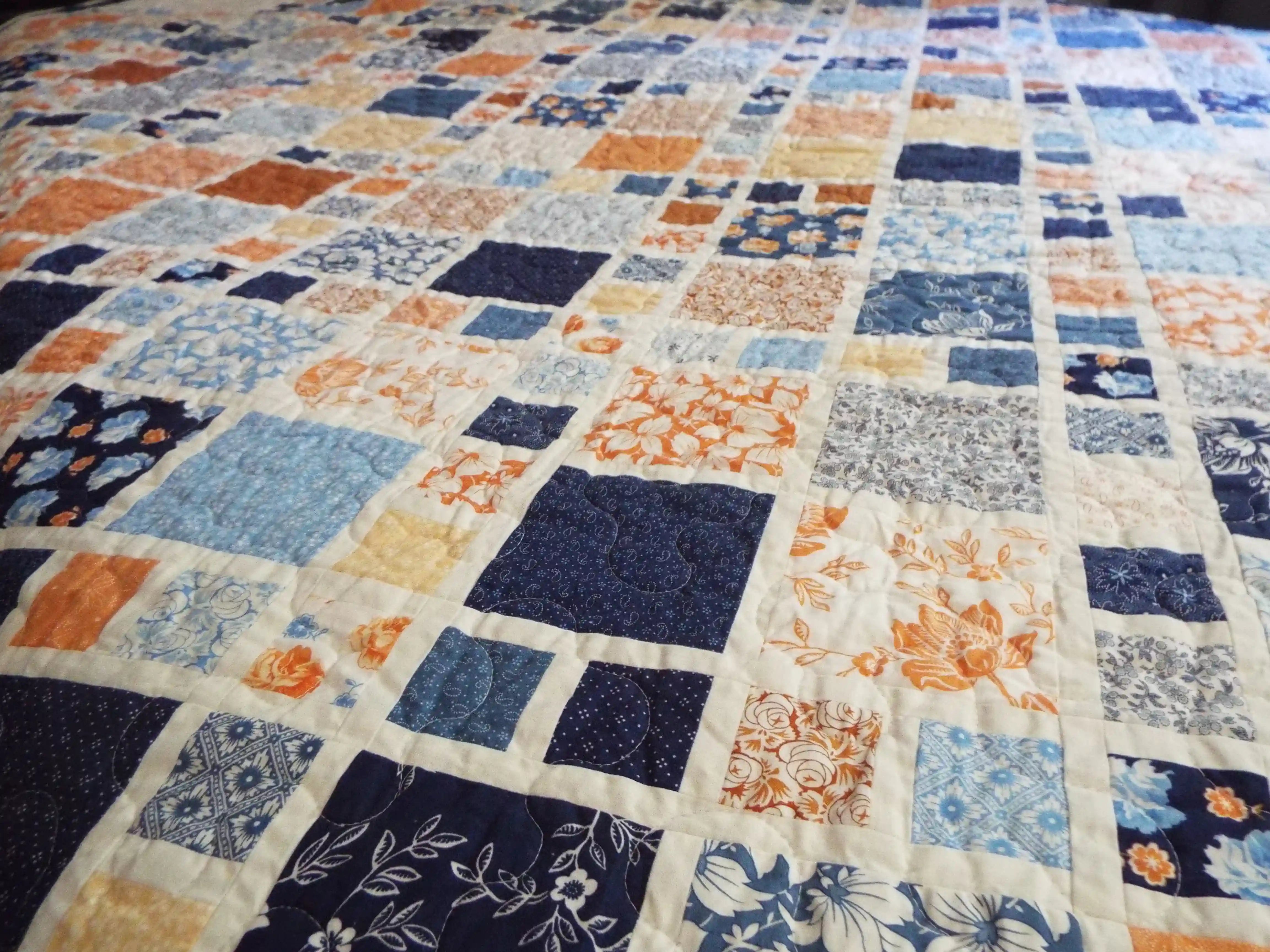 Overhead view showing the full quilt pattern and color field of blues, creams, and soft terracotta tones.