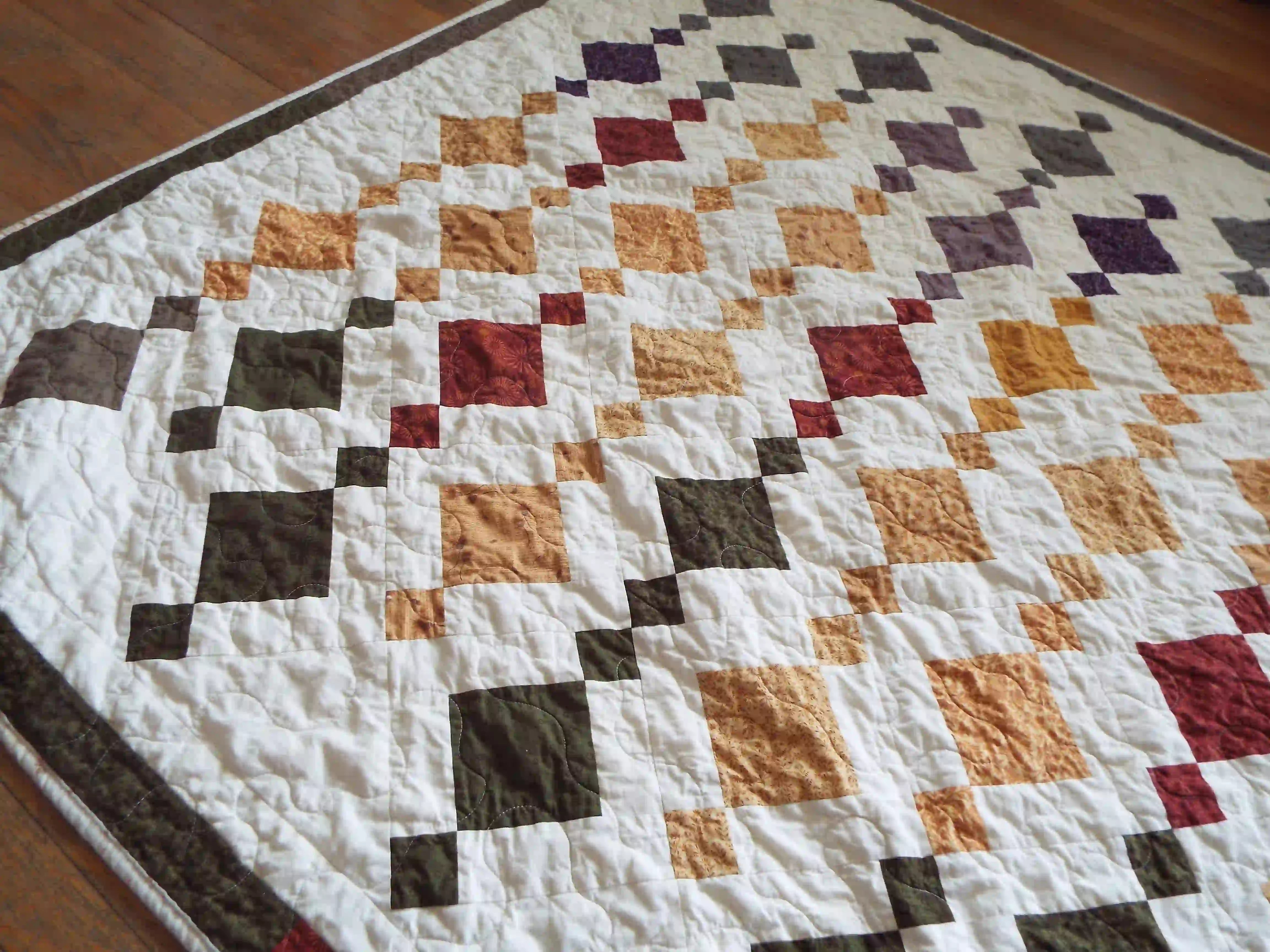 Embers at Dusk is a lap quilt measuring approximately 68" square, designed for everyday use — reading chairs, quiet evenings, and spaces that call for both warmth and structure.