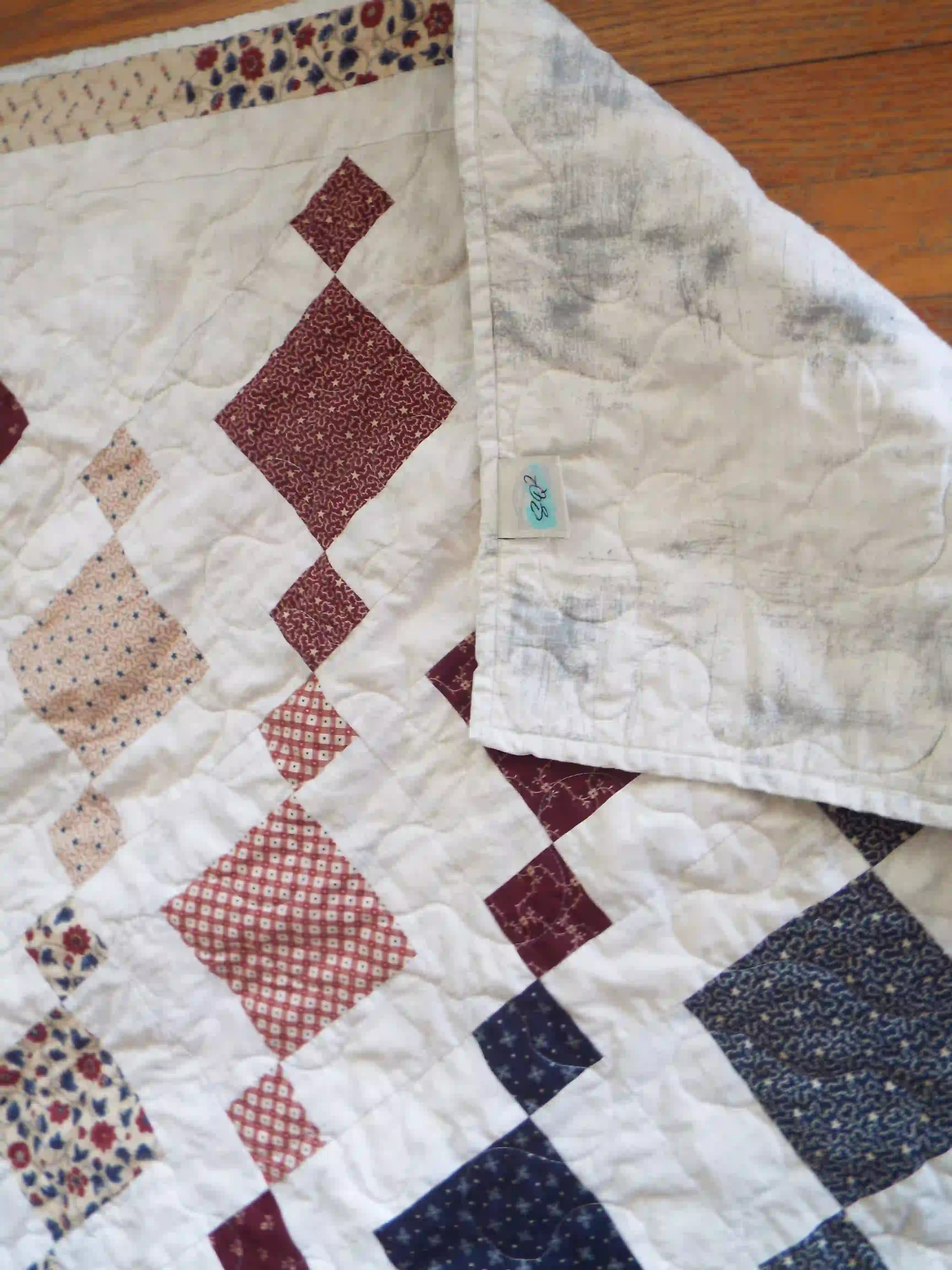 Set against a soft neutral field, a rhythm of diamonds moves through deep navy, warm reds, and quiet prints, creating a sense of movement across the surface without losing its sense of order. The palette carries a subtle Americana influence — familiar without being overt — allowing the quilt to settle naturally into a wide range of spaces.